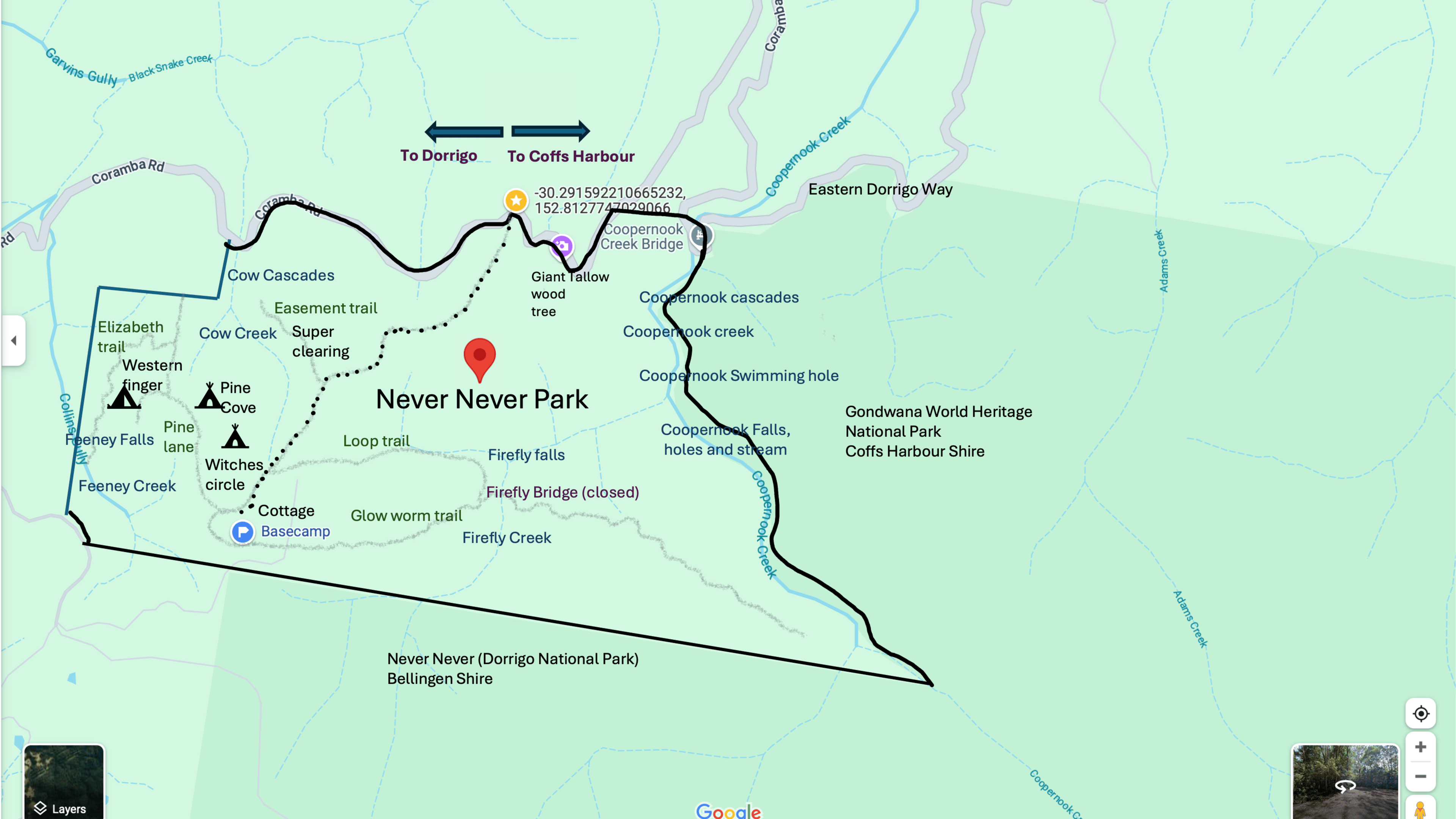 This is a hosted stay through Hipcamp, below is the information provided by the Host regarding their offering. Never Never Park is a Sub-Tropical Rainforest property which borders the ancient Gondwana World Heritage National Park on 2 sides including along Coopernook creek. Located half an hours drive Northeast of Dorrigo and 1 hour West of Coffs Harbour (via Eastern Dorrigo Way) in the beautiful Bellingen Shire, surrounded by various National Parks with 4WD tracks, crystal clear creeks, waterfalls, cascades, swimming holes and picnic areas. The property is 400 acres featuring spring fed mountain streams, cascades and waterfalls that run through its central gorge. First surveyed in 1906 and logged in the days of bullocks and hand saws, remnants of a bygone era remain including the “Jack Feeney Memorial Giant Tallowwood Tree”, a Champion Tree of Australia listed in the National Register of Big Trees. It’s over 50m tall, more than 1000 years old, and was around long before Captain Cook reached our shores. The landscape starts in dense Sub-Tropical Rainforest opening up to lush green pastures overlooking the amazing views to the west showcasing hedge-rowed rolling hillsides and 1600m high mountain range towards Marengo.