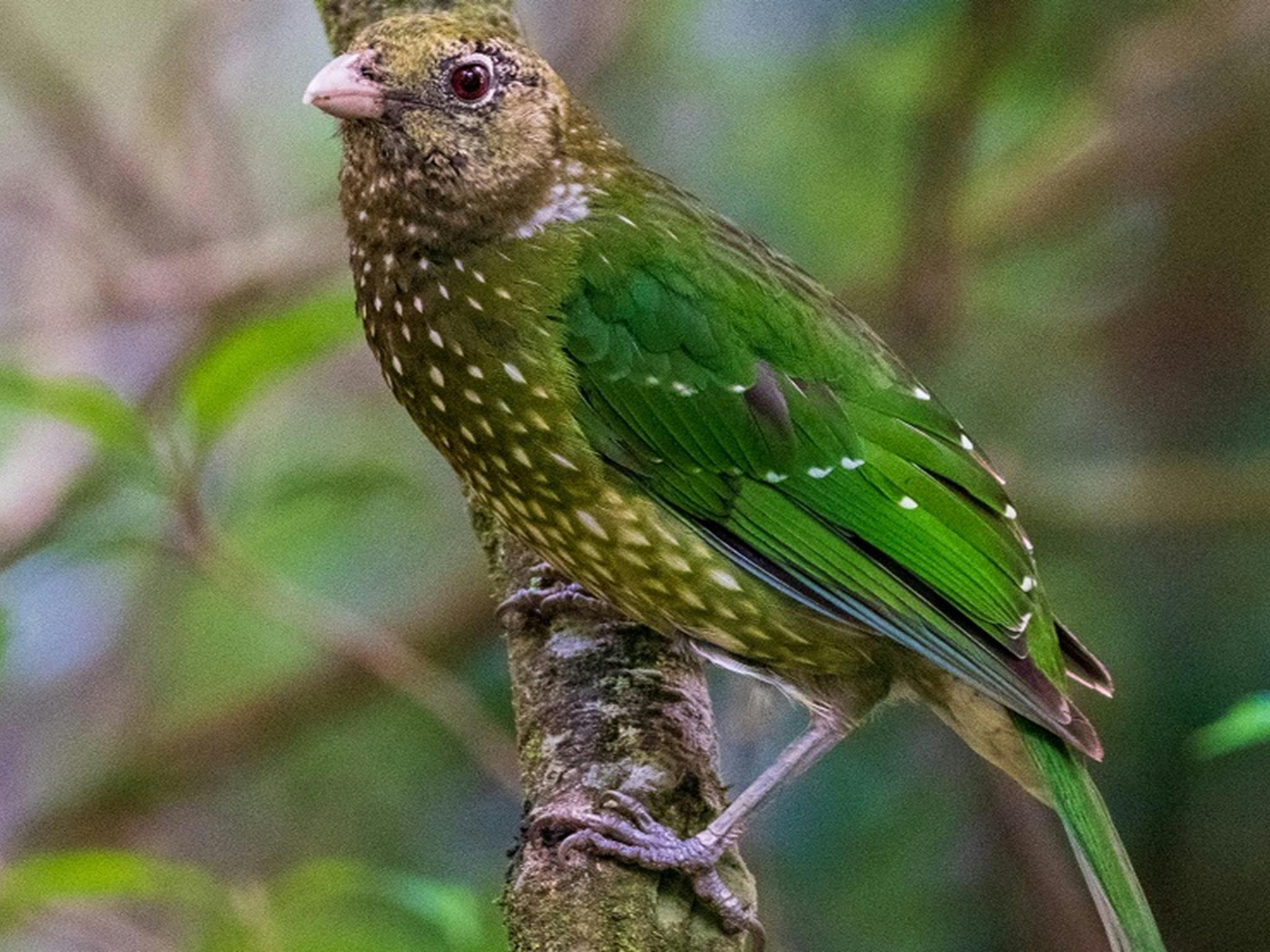 A green catbird, named for its cat's-yowl call. The bird's gorgeous green feathers camouflage it in