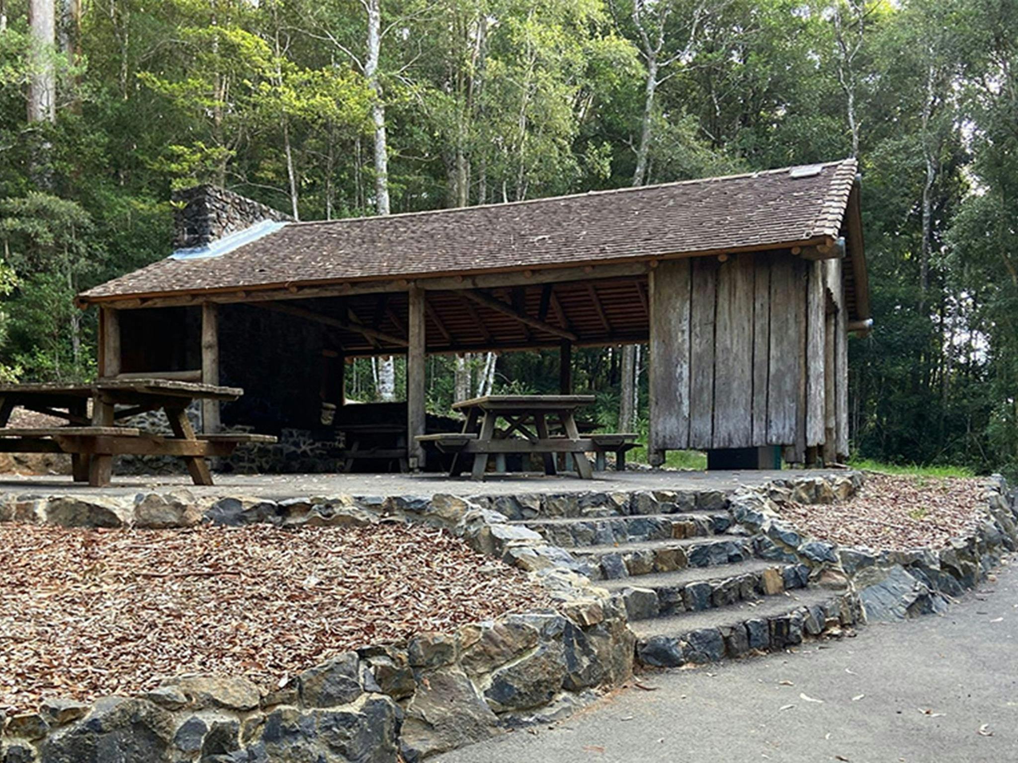 A picnic shelter and table at Never Never picnic area, accessible by stone steps or a concrete path.