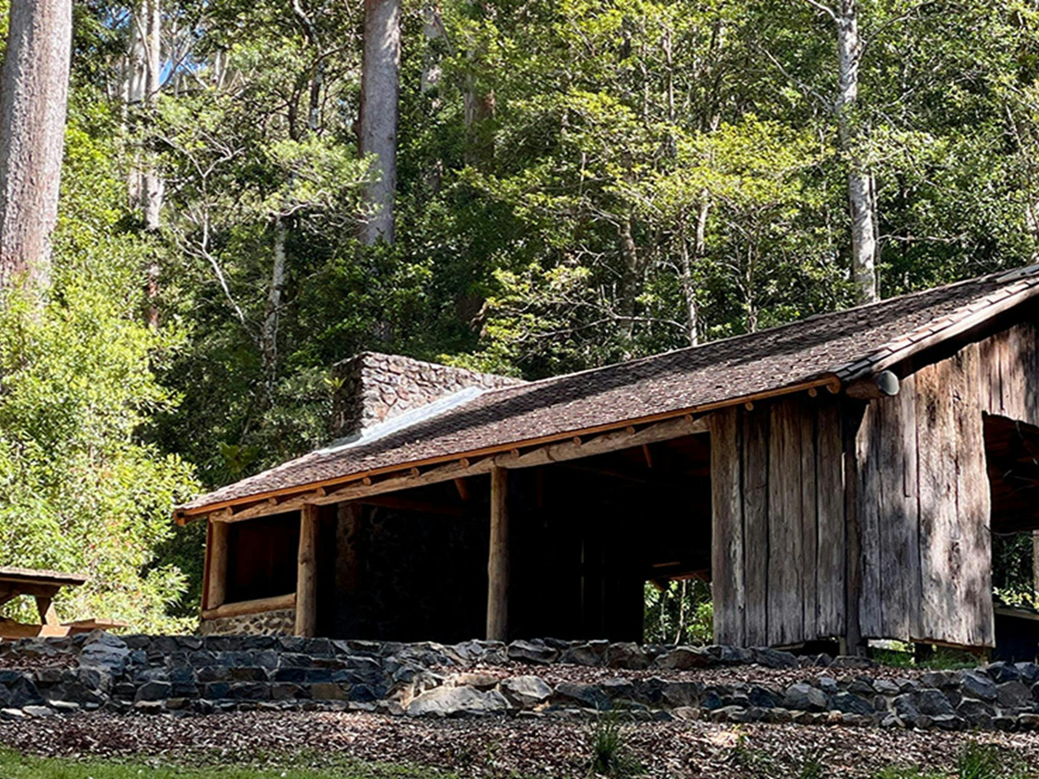 A shelter at Never Never picnic area surrounded by tall trees and bush in Dorrigo National Park.